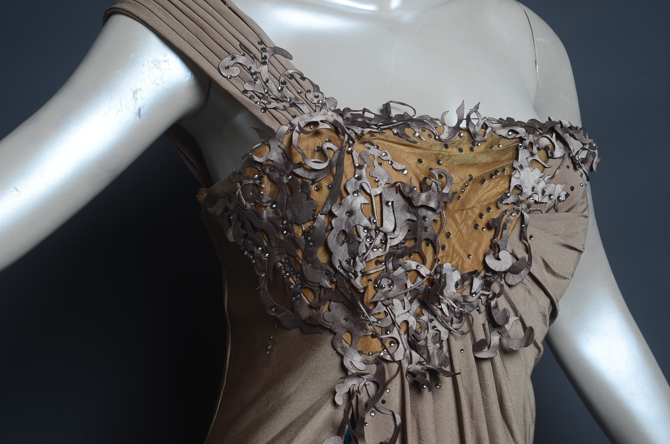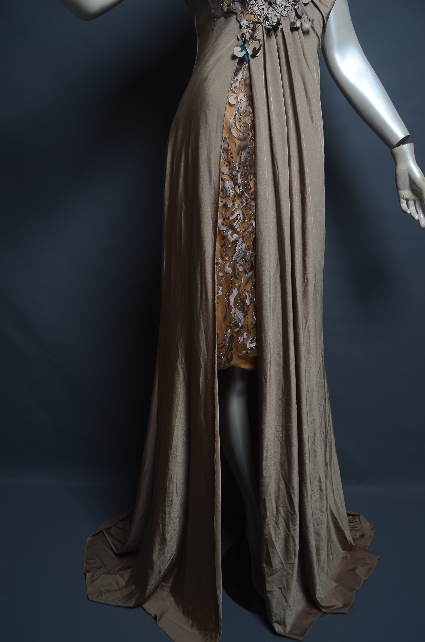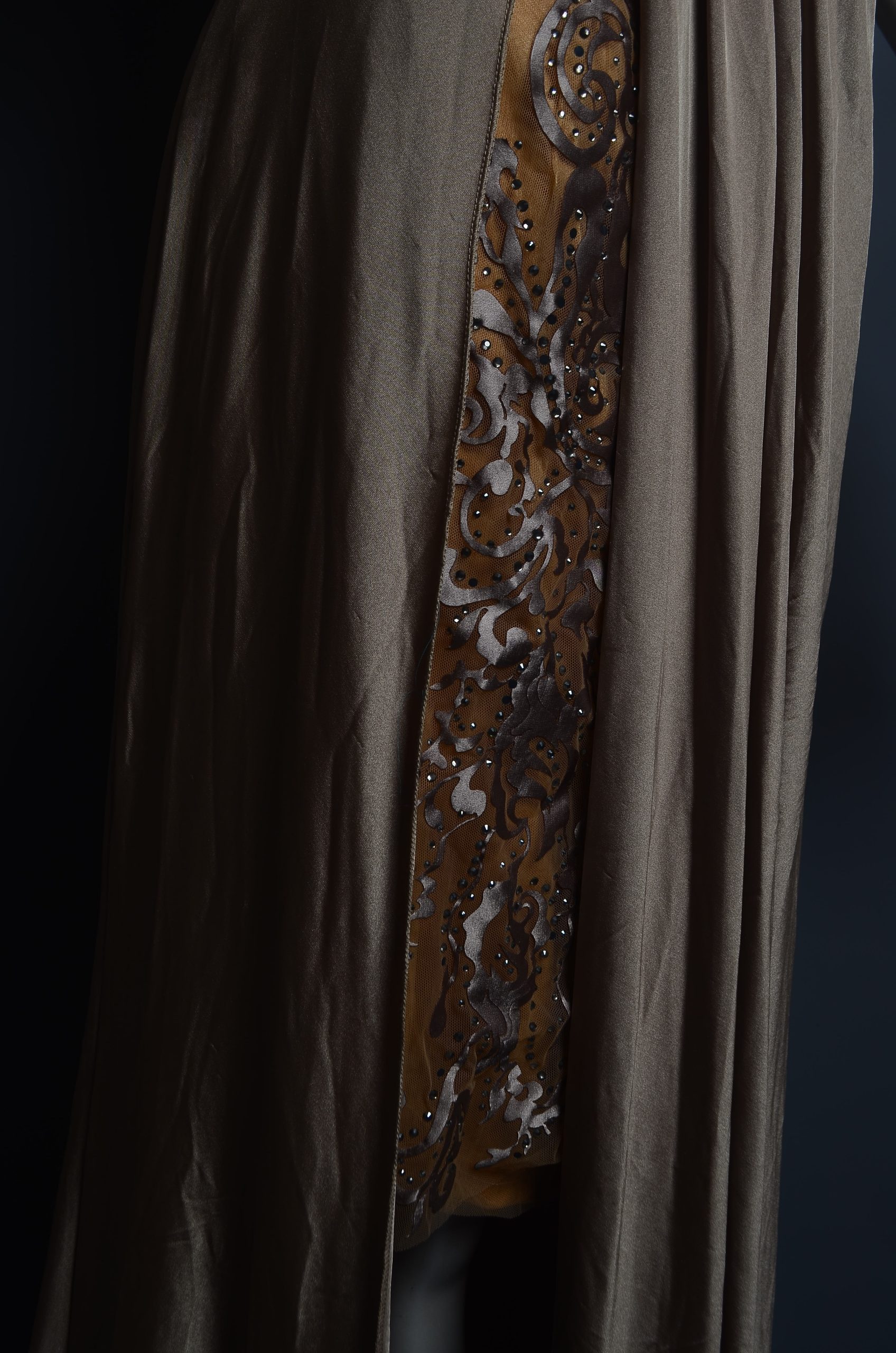 فستان سهرة باللونين البني والعسلي، قصير مغطى بقماش ستان منسدل مزين بالفصوص والنقوش