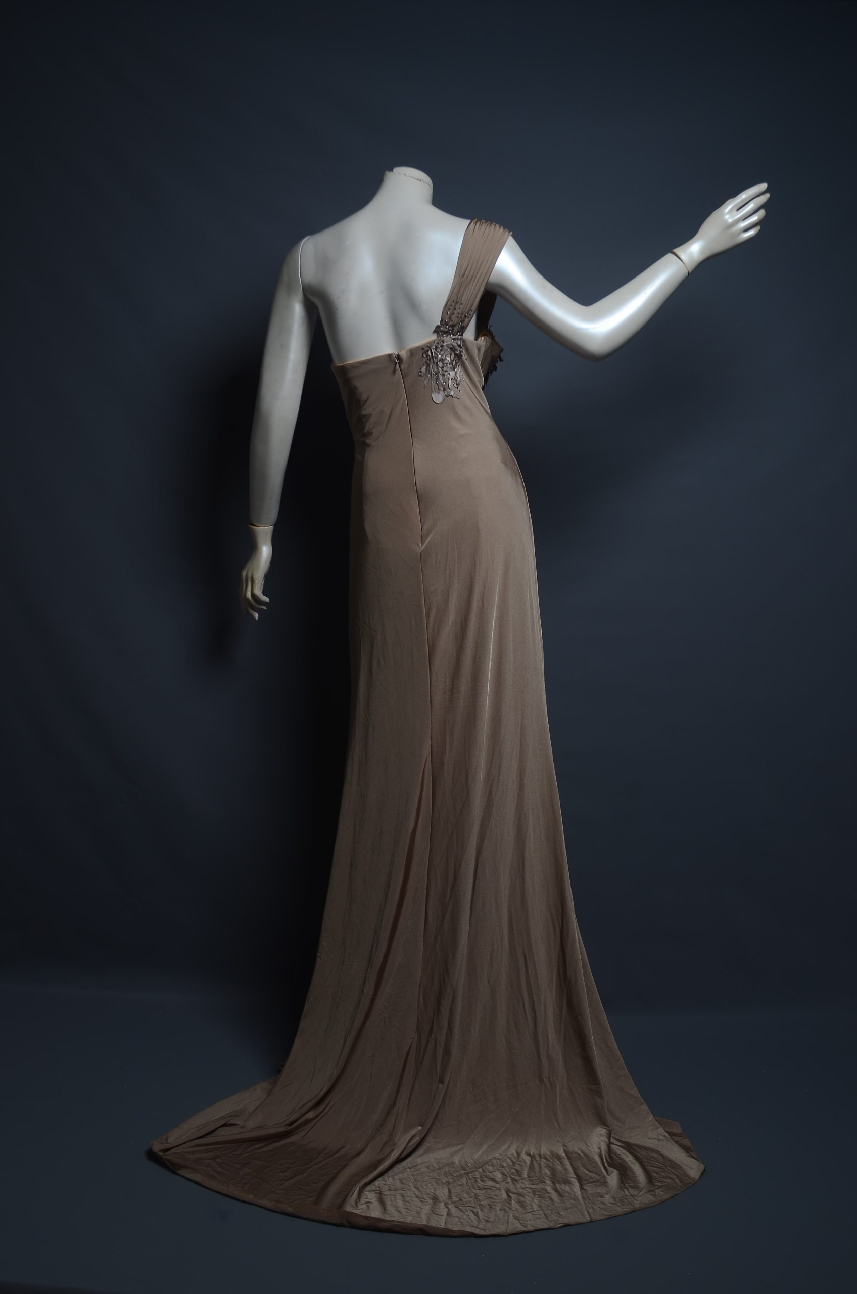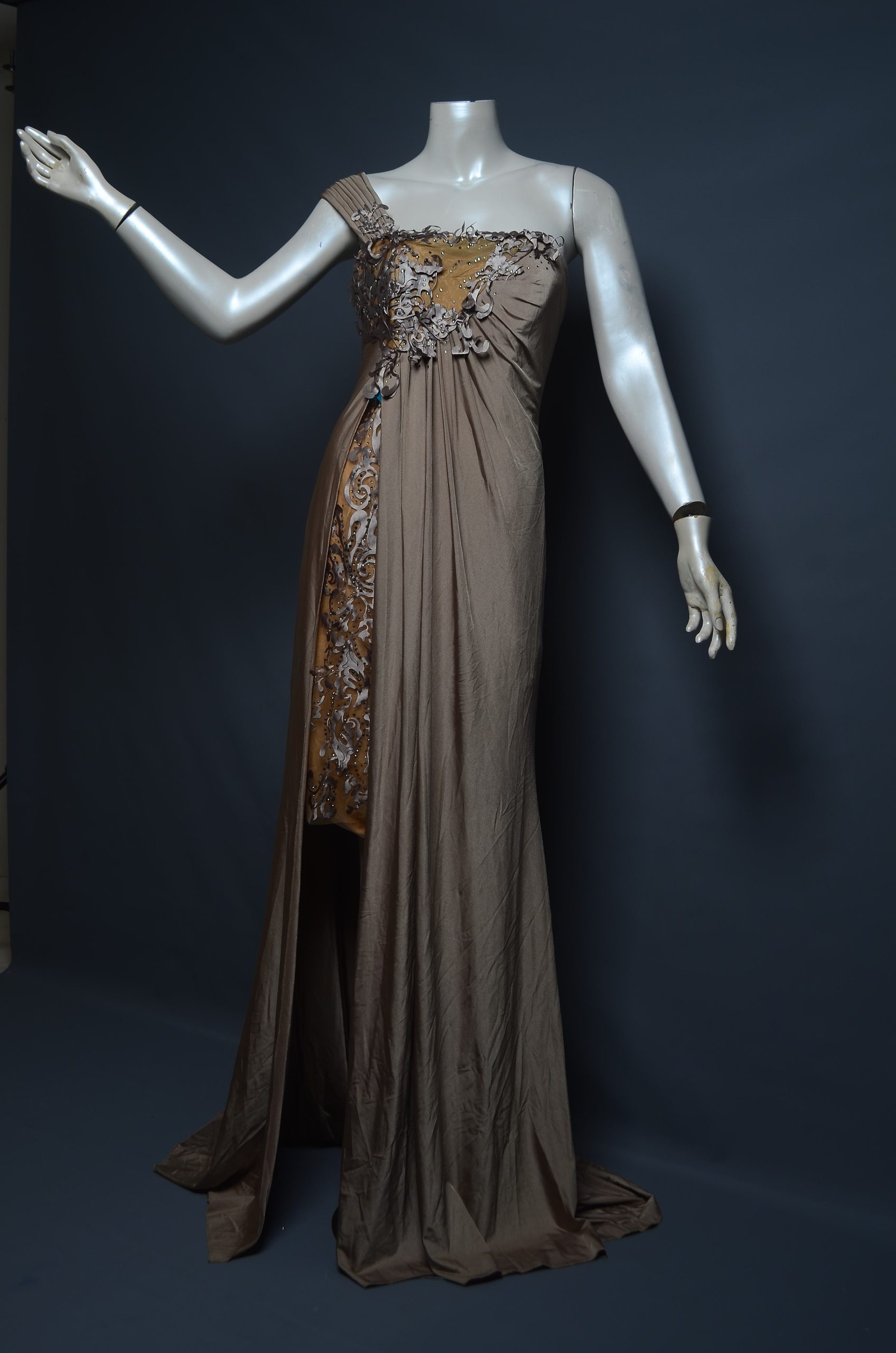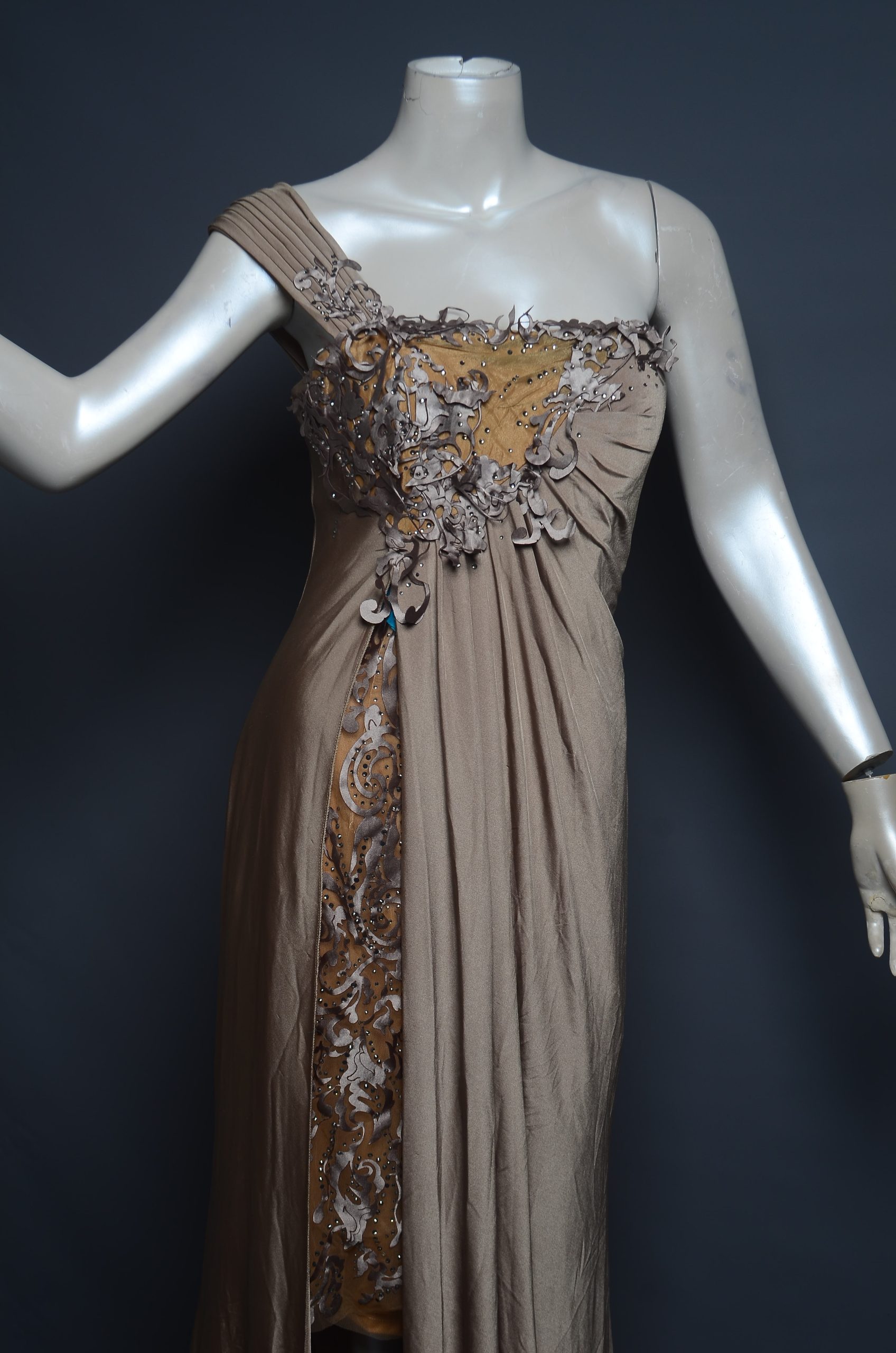 فستان سهرة باللونين البني والعسلي، قصير مغطى بقماش ستان منسدل مزين بالفصوص والنقوش