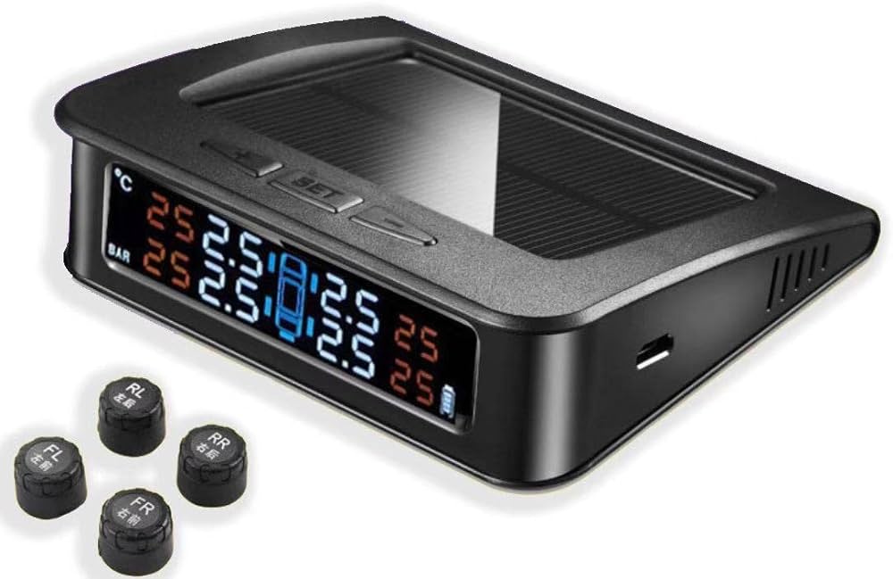 جهاز مراقبة ضغط هواء اطارات السيارات التلقائي اللاسلكي يعمل بالطاقة الشمسية، مع 4 اجهزة استشعار خارجية، 6 اوضاع تنبيه، شاشة عرض LCD لعرض درجة الحرارة والضغط الفعليين للاطارات الاربعة